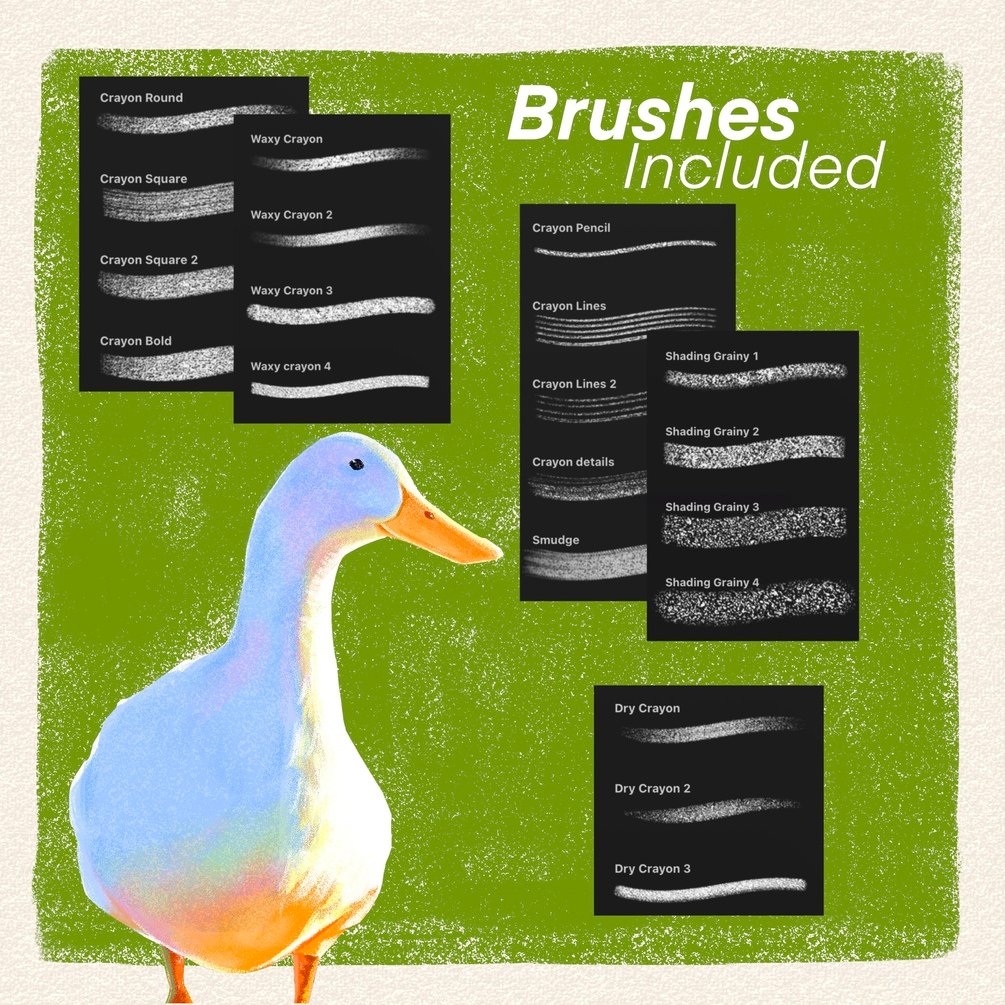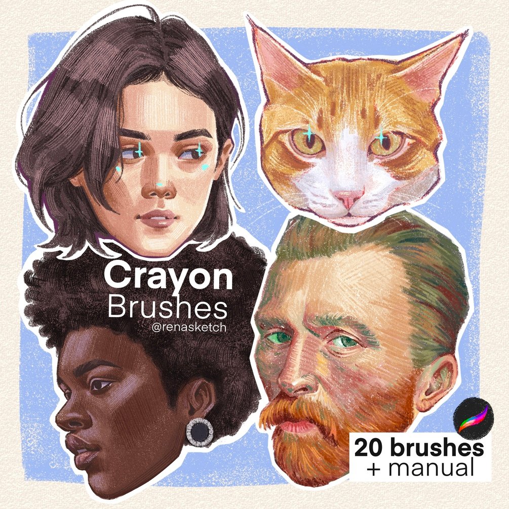 The Crayon Brushes set includes 20 brushes for painting in procreate. As the name says, these brushes simulate pencil crayons, featuring different textures and shapes, perfect for detailed illustrations.